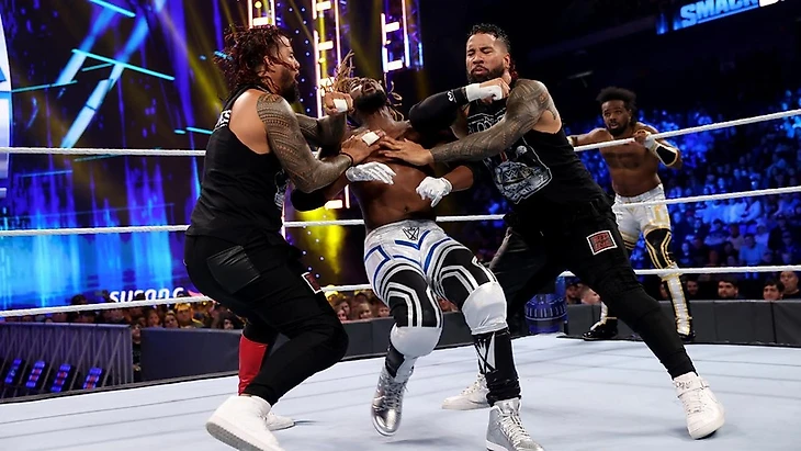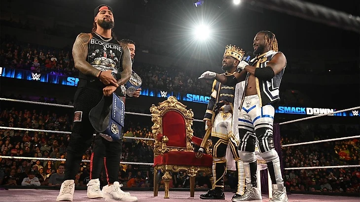 Но правые руки тут Джимми и Джей. С тех пор, как Новый День покинули SmackDown, на этом шоу многое изменилось, и теперь им управляют The Bloodline. А Кингстон и Вудс, видимо, нарядились так, потому что решили пораньше отметить Хэллоуин. Кофи предположил, что Усо завидуют. Ведь у Нового Дня новые, блестящие шмотки, а Джимми и Джей таскают одно и тоже с 2018. К разговору о Bloodline, Вудс вообще заявил, что никакой крови ни в какой ее проявлении Король не потерпит на своем ринге. Джимми и Джею не понравилось, что Новый День вздумали шутить. Ведь Экзевьеру совсем не до шуток будет, когда корону с его головы собьют киком. Новый День не оценили угрозы, состоялась перепалка, и Вудс всех заткнув, издав королевский указ: этот конфликт будет решен в суде путем боя. То есть, нас ожидает матч. «Вызов принят» — ответили Усо. Командные чемпионы же обратили внимание на скипетр победителя турнира KotR. «Что, прям настоящее золото?» — спросил Джей. Ответ был положительным. Он решил потрогать, но Кингстон ударил его по руке… за что получил панч от Джимми, и Усо сбежали на рампу.