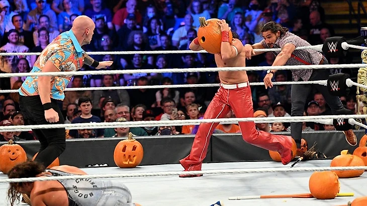 В общем, это уличная драка, но стилизованная под Хэллоуин. Тут у нас тыквы, скелеты, и все это можно использовать в бою, наравне со столами, стульями и кендостиками. Началась драка всех со всеми, по итогу которой Шинске завладел контролем, проведя несколько киков обоим противником. Рик же провел Моссу еще и гатренч суплекс, а потом схватил за прелелами ринга гитару, стал играть, пока Накамура атаковал «Сумасброда» в углу, получив кендостиком по спине. Этот эпизод позволил Корбину и товарищу перехватить контроль, как вдруг на аерене появился Реджи и толпа дамагеров. Естественно, ни к чему это не привело, и так эта толпа убежала обратно за кулисы, а Рик и Бэрон обменялись синхронными клоузлайнами. Мэдкэп атаковал Бугза, вытащил за пределы ринга и хотел окунуть головой в яблочный сироп(?), но Рик отчаянно сопротивлялся, и даже попытался реверсировать. Секундой позже к нему присоединился Накамура, и его удар палкой кендо по спине Мосса позволил окунуть последнего головой в яблоки. Еще один удар кендостиком, и Накамура, Бугз и Пэт МакАфи покушали яблоки, отправив нас на рекламу. Вернувшись, мы увидели, что Рика избивают оба оппонента кендостиками в четырехугольнике. Действие переместилось за пределы ринга, где Корбин хотел атаковать гитариста чашкой с конфетами, но кик Шинске выбил ее из рук Бэрона.