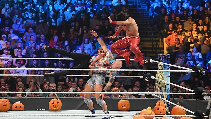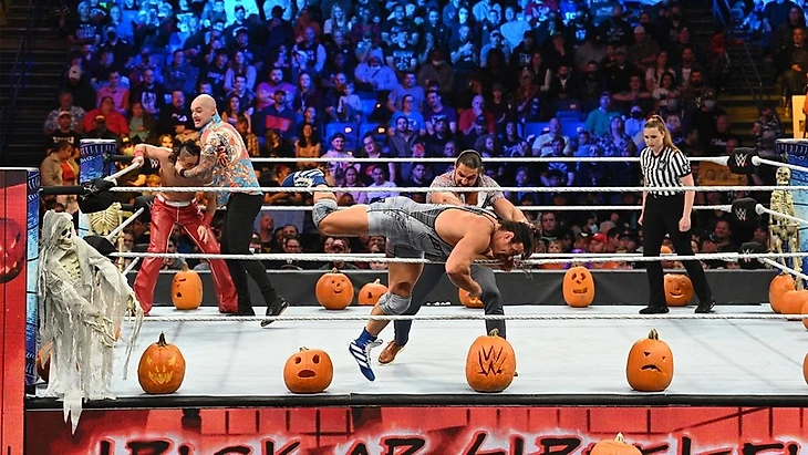 Знаете, как правило, подобного рода матчи сложны для оценивания. Но, имхо, не этот. Да, условия какие-то глуповатые, не очень много в них смысла, но в правильных руках, и тыквы с пластиковыми скелетами могут заиграть красками. И в WWE были удачные примеры подобных тематических командников. Этот матч в их число не попал. Спросите меня завтра, что мне запомнилось, и я не отвечу. Очень много сумбура какого-то, мало рестлинга, вообще почти не было именно командной работы. Причем выделили поединку порядка 10 минут, то есть, очень немало. Но, при всем при том, в своей категории это было окей. Что касается результата… я не удивлен, как ни странно. Да, по логике вещей, Накамура и Рик должны были получить возмездие за прошлую неделю, и фьюд, наверное, должен был продолжится, но учитывая то, что из Корбина и Мосса что-то пытаются лепить, логично, что они набрали в очередном бою немного momentum. Бугз и Шин же, очевидно, будут двигаться к вражде с Каррийо и Гарзой.