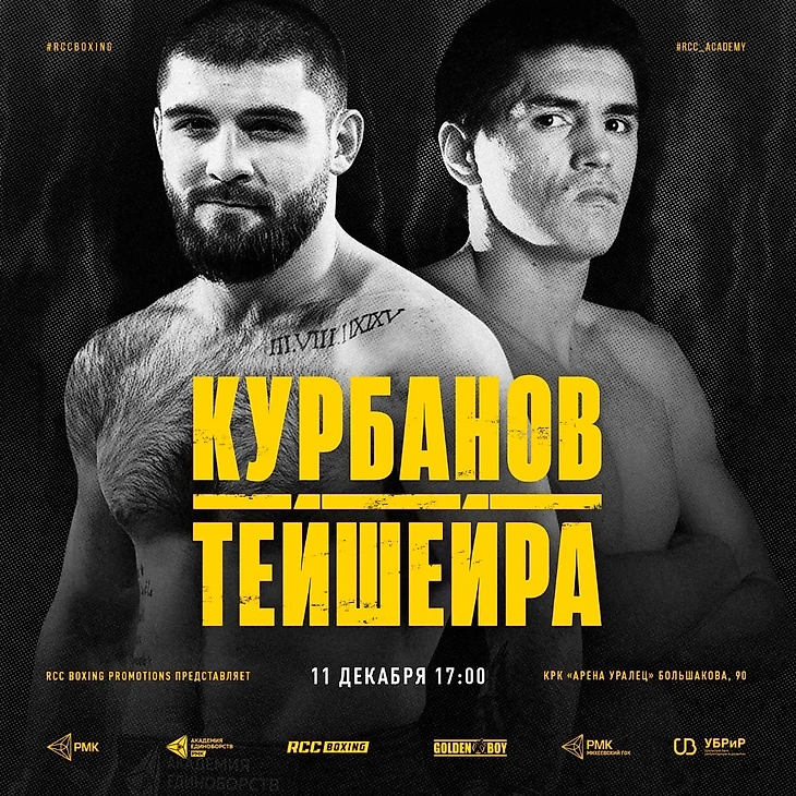 Боксер Академии единоборств РМК, второй номер мирового рейтинга WBO в первом среднем весе Магомед Курбанов (22-0, 13 КО) и четвертый номер рейтинга Патрик Тейшейра (31-2, 22 КО) проведут бой за титул WBO International. Контракты подписаны с обеих сторон — поединок возглавит шоу RCC Boxing Promotions, которое запланировано на 11 декабря в Екатеринбурге.
