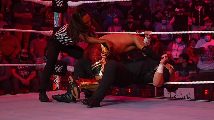 Сам по себе матч не вызывал интереса, но действие в нём мне показалось… нормальным? Ну оно хотя бы не было скучным и через него нитью проходило взаимодействие Найт и Грейсона, когда они то объединялись против Сикоа, то предавали друг друга. Но опять же — никакой интриги и очередной гвоздь (какой уже по счёту?) в гроб карьеры Найта на NXT.
