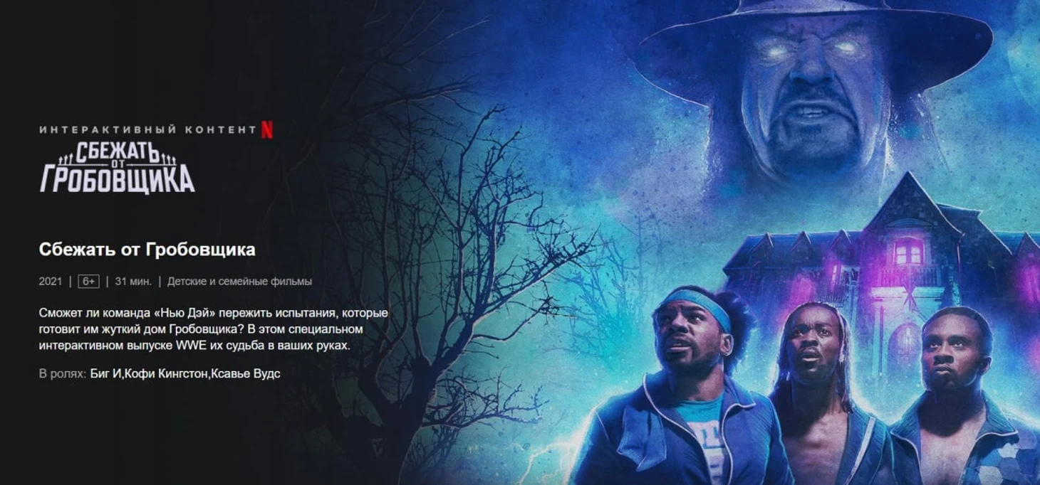 Netflix продолжает эксперименты с картинами, где зритель сам может принимать решение и в этом походе сервис добрался до WWE. Недавно компания выпустила работу (фильмом назвать это язык не повернется) под названием «Сбежать от Гробовщика». В главной роли там сам многократный мировой чемпион и команда «Новый день» в полном составе.