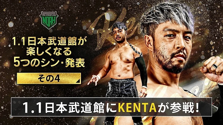 — Между всем этим делом был данный особый анонс: было показано промо с неким неизвестным человеком, который прогуливался у арены Ниппон Будокан и рассказывал о 2014 году как переломном для себя моменте всей жизни. И этим неизвестным оказался КЕНТА, чемпион США IWGP в тяжёлом весе. И не менее любопытным было именно то, что он рассуждал о последних событиях своей карьеры и о NOAH достаточно нейтрально, вне своего кейфеба как участник BULLET CLUB в NJPW. И из данного анонса стало известно, что КЕНТА вернётся в NOAH 1 января на шоу в Ниппон Будокан. Позднее был анонсирован специальный командный матч 3 на 3 при участии Кенты как тот самый матч для него на шоу от 1 января.