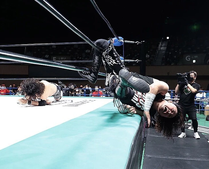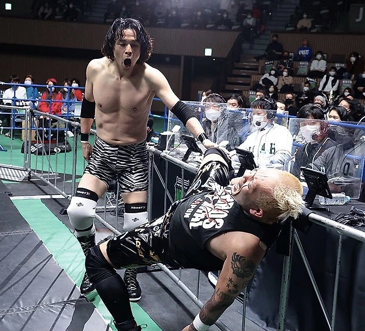 Победители: Stinger (Йошинари Огава и ХАЯТА) (титульная смена) (бой завершился масштабной потасовкой на рингсайде, из-за которой Эйта попал в ловушку в канатах от Огавы - сам Огава успел вернуться в ринг до счёта 20 от рефери и тем самым добыл победу для себя и Хаяты по отсчёту).