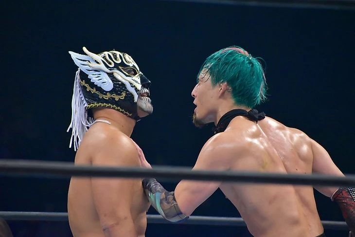 Пре-мэйн и один из самых ожидаемых матчей вечера. У меня тоже ожидания были высоки, ибо это же классика для пуро: тот самый командник на очень много человек, который может стать классикой (тот же Мельтцер кучу матчей с подобными вводными оценил на 5 звезд). Я не избалован матчами 5 на 5 с претензией на «бэнгер», так что это было интересно. Несмотря на то, что это был, как уже понятно, командный матч на дофига человек, причем участвуют в нем именно группировки, то есть, все 10 человек знают, как работать в связках, запомнился поединок не только командной работой (хотя ее было много, и она была хороша), а скорее очными мини-схватками. Конго напали на соперников на старте, толпой побили Найто, но LIJ защитили своего лидера. Это был не единственный раз, когда гости из Pro-Wrestling NOAH провоцировали большую драку. Ну так вот, о мини-схватках. Во-первых, конечно, симпатичными взаимодействиями отличились Найто и Кено. Во-вторых, прекрасный отрезок с налетом луча-либре выдали те, его больше всего для этого подходит: Хирому Такахаши и Алеха. БУШИ тоже принял в этом участие. Не обошлось и без разборок бывших командных партнёров (в AJPW) - САНАДЫ и Манабу Сойи. Ну и как вишенка на торте — борьба Катсухико Накаджимы и Шинго Такаги уже ближе к финишу.