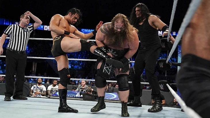 Бою предшествовал сегмент с командными чемпионами бренда The Usos (их кстати представила новый анонсер - Саманта Ирвин, работавшая последний год в NXT). Джимми и Джей отдали должное Кингстону и Вудсу, говоря о них как о настоящих конкурентах для Усо. Но даже они ныне не ровня лучшим здесь и "единственным" как Усо. Сейчас же они готовы не только оказать помощь Роману Рейнсу в борьбе против Сета Роллинса, но и понаблюдать за определением новых претендентов для себя. Джимми или Джей (тут я реально не понял кто есть кто) в полусерьёзной манере начали анонсировать участников большого матча за тайтл-шот. Завершился процесс двумя суперкиками от чемпионов по Эрику и Умберто Каррилльо, что спровоцировало драку между участниками матча.