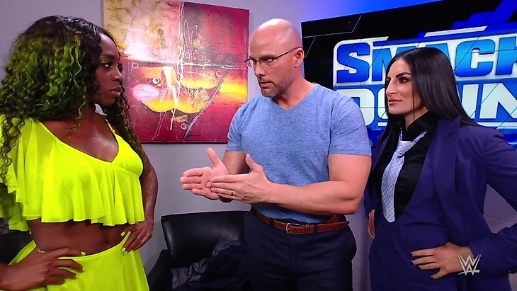 — В кабинете руководства к Соне Девилль подошла Наоми. Та пошутила на тему холода в её сердце (хотя Соня на Снежную Королеву не больно уж похожа типажом), а затем стала открыто угрожать Соне по поводу всех её выкрутасов. Девилль снова напомнила, что тут и сейчас, пока на Соне этот костюм - она босс для Наоми и та не имеет право трогать её. К тому же Наоми не стоит тут строить из себя героя, если она простой рядовой статист. Своим поведением она рискует лишится всех регалий, места в женской Королевской Битве или вовсе местом в компании. Наоми пришлось молча уйти, понимая что не имеет влияния на ситуацию, к тому моменту вошёл Адам Пирс (Хотелось бы наконец-то увидеть развязку всего этого конфликта, но похоже что эта развязка получит своё место на WrestleMania 38 в том самом отдельном матче, если до этого не начнётся серия таковых матчей. Многие уже давно не в восторге от этого конфликта, зато активисткам явно нравится);