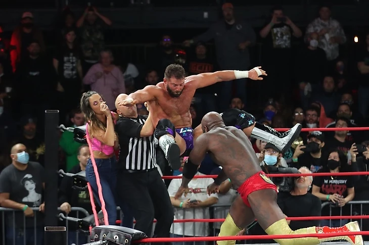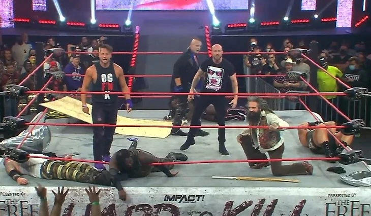 Личное мнение автора обзора: думаю что не только у меня одного возникли ассоциации правил этого матча с правилам Военных Игр, которые проводили NWA, WCW, MLW, AEW и NXT. Но у IMPACT нет возможностей работать на больших аренах, где можно воплотить полную версию собственных Военных Игр, ввиду их популяризации за последние 2 года в американской инди-сцене (даже GCW начали их проводить у себя), не вспоминая WWE. Но думается что если бы тут были бы именно полноценные Военные Игры, матч смотрелся бы не только в разы веселее и забавнее, но и куда более жестоким и интригующим. Да и судя опять же по ходу этого боя - это был первый таковой вот опыт массового побоища безо всяких правил. И именно командный опыт такого взаимодействия для его участников, особенно на 10 человек в одном ринге и вокруг него. Отчасти действия тут бывали вялыми и да по некоторым участникам было заметно, что они несколько переживают друг за друга, учитывая специфику такового матча. Но старания участников также стоит отметить, ибо они старались не только не перегнуть до безумства и одновременно проявить фантазию с столкновениях между собой, имея полную свободу в оружии и отсутствии ДК. тут также стоит отметить определённую отвагу Хита и Эрика Янга - людей, которые недавно вернулись в строй после лечения от серьёзных травм, не говоря про Рича Суонна с его травмами шеи и ноги. Остальные же, кроме Эдвардса и Мака разве что, просто не имели должного опыта в прошлом в подобных матчах. Но опыт здесь им точно пригодится. Это было весело, это было отчасти кринжово и это было достаточно брутально для формата IMPACT и для матча с долгим отдельным сторилайном вокруг только пятерых его участников и остальных в качестве массивного прицепа статистов. Только вот жаль, что матч как таковой послужил именно как подспорье для сегмента после него самого. Потому что вторжение бывших рестлеров ROH, да и ещё так скоординировано, да и ещё тех, кто буквально пару месяцев назад только-только завершили своё годовое противостояние в почившем ROH - ну тут напрашивается аналогия прежде всего с.... тем самым сторилайном между ROH и CZW в середине 00-х гг. К тому же я лично не ожидал подобного расклада, ибо истории с Джонатом Грэшемом и Рок-Си с Деонной Пурраццо из Final Battle прошлого года - это всё-таки отдельные строки, которые организовать в целом не очень сложно. А тут целый сюжет с потенциальной войной ростеров двух промоушенов между собой - особенно с учётом того, что ростер IMPACT сейчас также под огнём пришлых из NJPW, особенно гайдзинов BULLET CLUB во главе с Джеем Уайтом. А учитывая и тот факт, что формально сотрудничество NJPW и ROH не прекратилось на официальном уровне - то тут сюжет для любого киноблокбастера с историческим контекстом. И похоже что IMPACT готовы запустить таковой сюжет в период зимы и весны этого года.