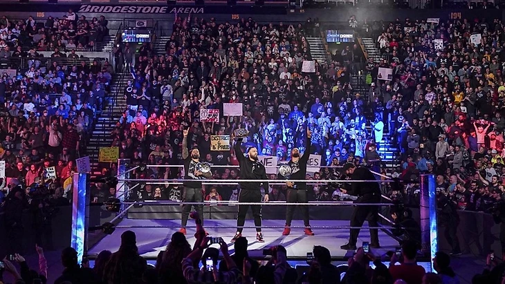 Шоу в этот раз остановилось в Нэшвилле, столице кантри-культуры США. И Усо на правах главных в командном дивизионе и как соратники "Вождя Племени" тут не ради каких-то обсуждений Сета Роллинса, Кевина Оуэнса или даже "Зверя" Брока Леснара. Они тут на ринге ради одного единственного - неоспоримого, непобеждённого и сражающегося главного чемпиона не только синего бренда, но и всего WWE, честью которого называть своего кузеном и братом... чемпиона Вселенной WWE на протяжении уже 508 дней - Романа Рейнса!!! Сам "Глава Стола" по классике растягивал момент и даже приправил это дело своей широкой улыбкой для зрителей, после чего требовал от Нэшвилля признать его своим Вождём. После этого было показано видео пути Романа Рейнса с 30 августа 2020 года (PPV Payback) и до сегодняшнего дня - как уже известно, за весь срок своего тайтл-рейна Рейнс защитил чемпионство Вселенной WWE аж 18 раз (также вполне себе серьёзное достижение, уж для титула с историей в 5,5 лет существования - и вовсе свой рекорд).