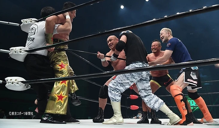 — Последним побочным матчем шоу выступил бой 4 на 4 между основным составом Sugiura-gun и команды из Мохаммеда Йонэ, Кинг Тани, Масакатсу Фунаки и Го Шиозаки. Последний выглядел несколько потерянным, ибо остальные участники устроили между дедовские разборки с взаимными издёвками и прочим беспределом на ринге и вне ринга. Фуджите, Сакурабе и Фунаки тут и вовсе было что вспомнить из собственного прошлого в ММА. Вся эта свалка продлилась 18 с половиной минут, а победили тут, естественно, Sugiura-gun (Фуджита принёс команде победу после бомбу на Кинг Тани).