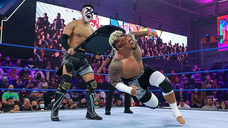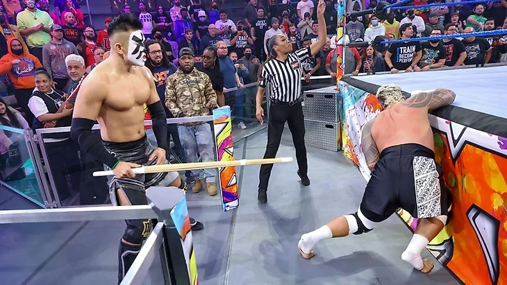 А 2 недели назад оба попытались сразится между собой, но ситуация вышла из-под контроля и бой завершился двойным каунт-таунтом, т.е. отсчётом от рефери из-за драки бойцов вне ринга. Промо с прошлого выпуска от Сикоа подчеркнул желание последнего завершить эту историю в более брутальной версии их первой схватки - отсюда и возник поединок без дисквалификаций и с удержаниями где угодно.