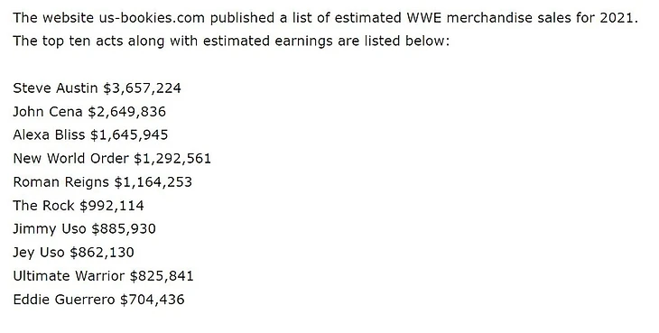 Здесь мы обратимся к PWMania и их информации о продажах мерчендайза. И кто вы думаете лидер по продажам в 2021 году в WWE? Стив Остин! И здесь старая гвардия впереди планеты всей. На втором месте Джон Сина, а на третьем вдруг оказалась Алекса Блисс. Роман Рейнс только пятый. Хотя бы тут он опередил Рока. При этом, самоанца чуть не обошли его два товарища — братья Усо. Разница между Романом и его друзьями составила чуть больше ста тысяч долларов.