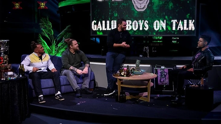 — Gallus продолжают веселиться на полную катушку, прогуливаясь за кулисами и обсуждая прошедшее ток-шоу. Наконец, Вольфганг отсоединяется от братьев Коффи и прогуливается в очках Ray-Ban по коридору, как вдруг на него со спины нападает Джордан Девлин. Один четкий удар стулом позволяет ирландской рок-звезде вернуть свои очки.