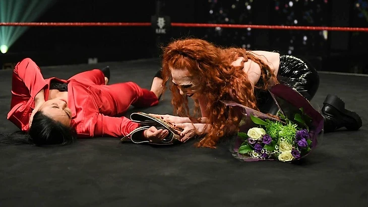 Неожиданно свет в зале гаснет, раздается безумный смешок и приветствие с характерным шотландским акцентом. Вещает, конечно же, Айла Доун, которая под музыку направляется на ринг и заявляет о своем желании присоединиться к празднику Мейко Сатомуры. Ведьма также благодарит чемпионку за то, что та дала ей цель и желание. Доун хочет заполучить последний трофей, коим и обладает Мейко. Сатомура в свою очередь отвечает, что Айла – достойный соперник, и если она хочет матча за титул, пускай просто попросит. Доун смеется, ведь она ничего не просит – она просто берет. Секунду спустя, Айла уже обнимается с букетом сраженной метким киком Сатомуры и, откусывая от цветков лепестки, отступает к титантрону.