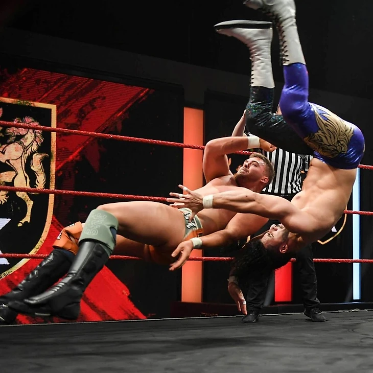 К слову, о Смите – вот он, пожалуй, был слабым звеном и абсолютно заслуженно проглотил победное для MM удержание. Он стал тяжел, неуклюж и очень некрасиво запорол парочку важных моментов со своим участием (благо, в одном из них Севен сумел выкрутиться). Матч шел по нарастающей, уверенное доминирование чемпионов сменилось непрекращающимся back-and-forth, Севен занервничал и решил закончить бой в максимально короткий срок, для чего пожертвовал собой в самоубийственном марш-броске с ринга через канаты вместе с Картером и провернул тот самый финт с ногой на канате. Я был очень высокого мнения о дороге Трента к его первому титулу в NXT UK в 2020-2021 годах, и хочется верить, что рейн Moustache Mountain и последующий фьюд учителя и ученика, который просто не может не состояться, порадуют меня не меньше. Во всяком случае, первая защита усатых друзей порадовала, пускай и времени ей можно было выделить минуты на 3 побольше.