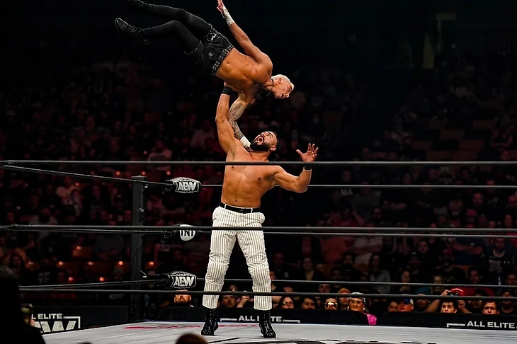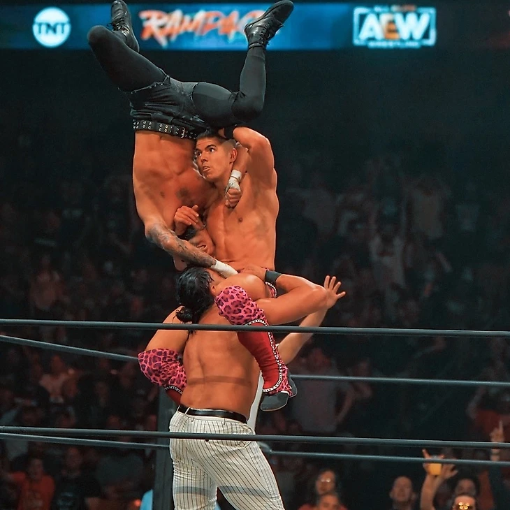 У рестлеров было не так много времени, всего 13 с небольшим минут, но они наполнили красотой настолько, насколько это было возможно, при этом работая не исключительно по схеме «2 in 1 out», а очень много взаимодействуя полным составом. Тут и историю о команднике на PPV продвинули, что было, пожалуй, одной из главных целей матча, и много отличной работы показали, и затизерили, что в команде Дарби и Сэми не все так однозначно в концовке. Интрига определенная в бою тоже была, ибо все-таки трехсторонник, и в AEW вполне могли бы воспользоваться этой возможностью, хотя, наверное, не устраивать титульную смену сейчас — это правильный ход. Я не большой фанат идеи того, что Андраде проигрывает 2 недели подряд, но, надо признать, его поражение сделали настолько защищенным, насколько в этой ситуации возможно.