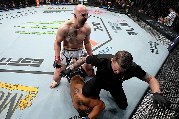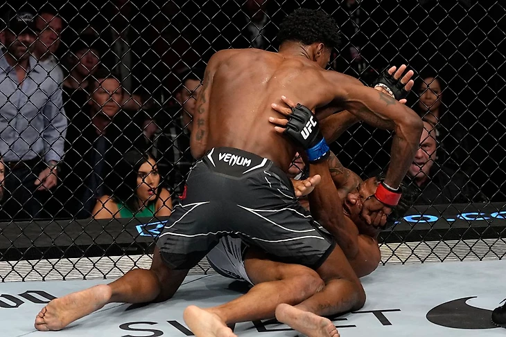 После того, как Холланд умудрился нокаутировать Жакарэ Соузу, сидя на пятой точке, волна хайпа мгновенно подняла американца на самый гребень, протащила через два поражения и выбросила в другую весовую категорию. И такое бывает! Поприветствовать Кевина в полусреднем весе подрядили бывалого Чарльза Оливейру. И в первой пятиминутке "Ковбой" устроил Кевину настоящее родео. Бразилец бросал Холланда на покрытие и в стойке драться не тушевался. Американец смекнул, что пора предпринимать активные действия и во втором раунде ударом отправил Чарльза на землю и побежал добивать, что есть мочи. Кевин снова встал на победные рельсы и неплохо заявил о себе в новом весе.