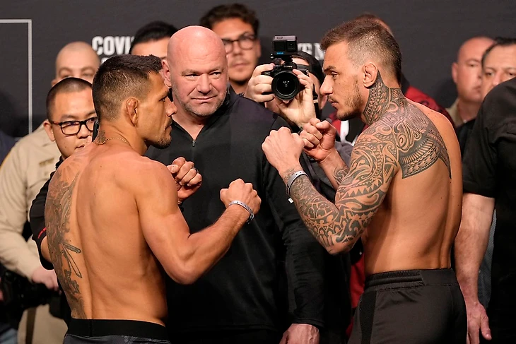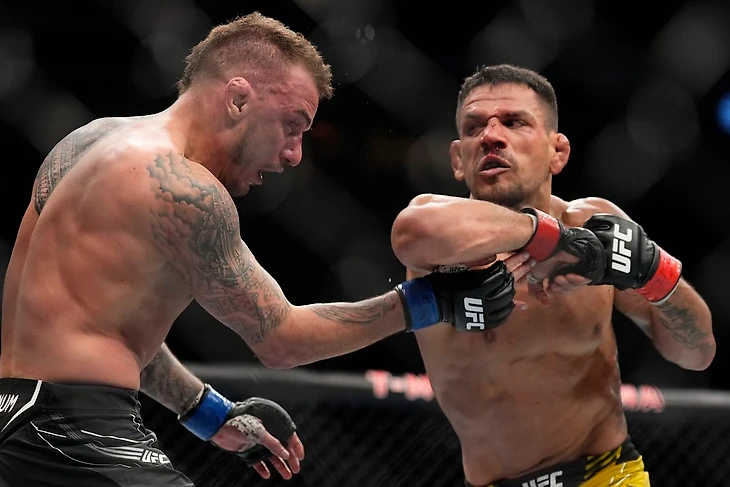 Претендент на звание "Боевик года". Хотя без драмы не обошлось. Сначала с бразильцем должен был подраться Рафаэль Физиев, но "Атаман" выбыл из-за болезни. Затем на замену мог выйти Ислам Махачев, но не случилось. В итоге скрестить перчатки с дос Аньосом согласился Ренато Мойкано. Последний отбился буквально недавно и уж точно не был полностью готов. Рафаэль бил, бил, а потом ещё бил оппонента. В третьем раунде Ренато пропускает удар ногой в голову и падает. Но выживает. Снова и снова. К пятому раунду у Мойкано уже закрылся глаз, кровь размазана по лицу, а секунданты всё гонят его в бой. Но его и гнать-то никуда не надо. Он сам пойдёт, даже если Рафаэль будет стоять напротив него с битой в руках. Ренато не желает сдаваться и сам отгружает Дос Аньосу под конец схватки. Рафаэлю поднимают руку. Но в таких боях проигравших не бывает. Ренато достоин похвалы за свой несгибаемый характер. Настоящий триумф духа!