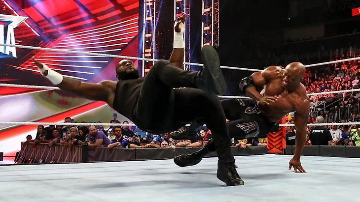 Эрик осыпал соперника ударами, который тот просто «впитал», а потом вырубил «викинга» лэриэтом. Тот укатилсяз за пределы ринга, судья начал отсчет, Айвар прошел проверить состояние партнера… и в итоге Viking Raiders были отсчитаны до 10, а Омос победил. Айвар хотел было атаковать гиганта, но получил кик на апроне. Интервьюер Кевин Патрик поднялся на ринг, поздравил Омоса с его несокрушимостью и спросил, есть ли кто-то, кто пугает здоровяка как потенциальный соперник. Тот посмеялся и сказал, что никого не боится. Он непобедим и доминирует над всеми. Кевин переспросил, неужели нет никого, кого Омос уважает. И тут на арене появился Бобби Лэшли. Он поднялся в четырехугольник, поиграл в гляделки с Омосом, а фанаты ли рады видеть «Всемогущего». Омос же взял и оттолкнул бывшего чемпиона мира. Лэшли попытался провести шоулдер тэкл, но Омос его не почувствовал, а стал издеваться над Бобби, направил его в угол ринга. Лэшли разозлился, провел еще один тэкл, который не оказал особого урона, но потом уклонился от одной из атак, как следует разогнался и обрушил Омоса на настил мощным шоулдер тэклом. Причем Лэшли сам не устоял на ногах после контакта, но своего добился. В общем, «инсайдеры» не врали, и чуть позже нам официально анонсировали этот матч на WrestleMania.