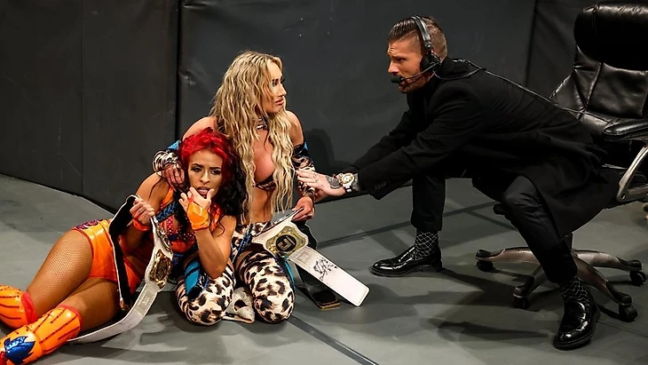 Нам напомнили, как неделю назад Кармелла и Зелина поругались, подрались и помирились. Сегодня они устроили фотосессию, но Кармелла послала фотографа, потому что устала. После этого командные чемпионки обсудили, как рады снова иметь идеальное взаимопонимание, а также выразили уверенность, что уйдут с WrestleMania все еще чемпионками, оставив не у дел всех остальных участниц боя за эти пояса и неприятно удивив публику. В кадре появились Шэйна и Наталья, которые сообщили, что на прошлой неделе командные чемпионки сумели взять вверх над ними, но этого больше не повторится. Поэтому в сегодняшнем командном матче 4 на 4 Мелле и Веге нужно отойти в сторону и позволить Наталье и Шэйне привести команду к победе. А с «Мании» с поясами тоже Нэтти и Бэзлер уйдут. Если сегодня Кармелла и Зелина готовы прикрывать спину напарниц, пока те уничтожают их соперниц, возможно, действующие командные чемпионки даже доживут до WrestleMania. Такой вот план.