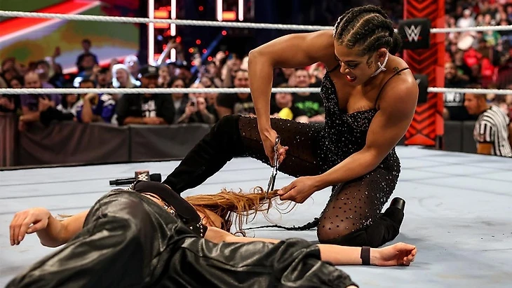 На самом деле, это намек на камбэк Коди и Брэнди Роудс. Помните, на заре AEW у Брэнди тоже был прикол с тем, что ее группировка срезала волосы у тех, кто не хотел дружить с Роудс? А если серьезно, то, в общем и целом, нормальный, рабочий сегмент, пусть и не хватающий звезд с неба. Но прибежавшие судьи и представители руководства, которые просто стояли вокруг и смотрели, до меня не доходят. Зачем они выбежали? Нет, конечно, можно попытаться это дело объяснить, типа, у Белэйр были ножницы в руках, холодное оружие, грубо говоря, они не хотели, чтобы кто-то получил ранения, если они начнут растаскивать девушек… но, имхо, это звучит, скорее, как оправдание с натягиванием совы на глобус, нежели как человеческое объяснение. Я имею ввиду, что в WWE такой трындец происходит, что если бы никто не прибежал, и девушки бы вдвоем сделали то же, что сделали, я бы вообще не говорил про отсутствие логики.
