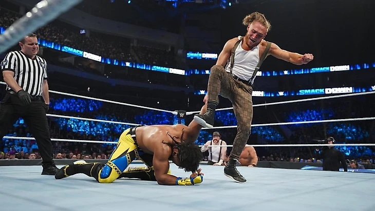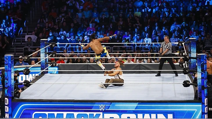 Перед матчем нам показали хайлайты того, что Шеймус и Холлэнд сотворили с Новым Днем на WM, после чего Шеймус и Ридж настрояли Бутча на бой с Вудсом. Наконец, бывшего чемпиона Соединенного Королевства, что называется, спустят с цепи, чтобы он разорвал представителя Нового Дня, ведь «every night is fight night». Естественно, товарищи сопровождали Пита по пути к рингу. Вудс вышел с Кофи, который поздравил ирландца и его друзей с победой на «Мании». Добро пожаловать в клуб людей с победами на WrestleMania, как говорится. Экзевьер попросил выключить музыкальную тему, потому что он хочет сказать пару вещей. Он напомнил Кофи, что Новый День не имеет победы на WrestleMania в этом году. Кингстон в ответ вспомнил свой триумф 2019 года, сказав, что часть этой победы принадлежит Вудсу. Да и всем нам. И так как Бутч и Ридж новенькие в WWE, Кофи с товарищем решили рассказать, как вещи работают в WWE. Раз WrestleMania — это финал сезона, то SmackDown после «Мании» — это начало нового сезона. И в честь этого вся статистика обнуляется. А раз статистика обнуляется, то счет в противостоянии 0:0. И напоследок Вудс сказал, что хорошенько подготовился к матчу, потренировался и внезапно получил звонок от тети Бутча. Даже она хочет, чтобы Экзевьер надрал британцу зад…
