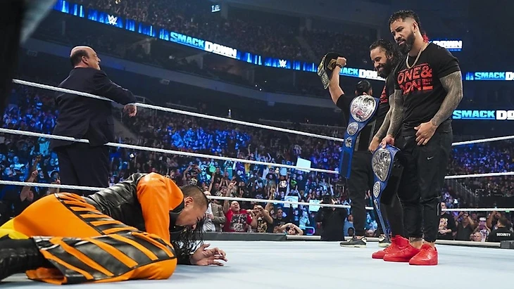 Перед финальным сегментом нам напомнили о том, как Рейнс стал абсолютным чемпионом мира. Вышел на ринг он, естественно, в сопровождении Усо и Пола Хеймана. По старой-доброй традиции Роман потребовал у Милуоки, чтобы они признали его. Реакция, как обычно, была смешанной. Рейнс решил поделиться кое-чем личным. Тем, что он с «мудрецом» Хейманом в последнее время часто обсуждали. SmackDown и чемпионства Вселенной было недостаточно, поэтому Рейнс отправился на «Манию», размазал «ковбоя Брока», забрав себе еще и RAW с чемпионством WWE. Поэтому если возникает вопрос «какой следующий шаг?», Роман не знает, что сказать, ибо не уверен, что можно достигнуть еще чего-то. Он уже сделал все, что можно. Но Bloodline еще могут многого достичь. За последнюю неделю он увидел немало фото Bloodline, исторических фото, не меньше. И «Вождь» заметил, что у него 2 пояса. А у Джимми и Джея только по одному. И этого недостаточно. Какое-то время назад он обещал Джею, что «они» поднимут Джея на новую вершину, какой тот раньше не достигал, он достигнет реального величия. И есть только один способ это сделать: объединить командные чемпионства, прямо как мировое. Он хочет, чтобы Усо отправились на RAW и добыли Роману командное чемпионство RAW. Вернее, они должны сделать это для себя. Но ведь то, что они делают для себя, они делают для Bloodline. Джимми и Джей с радостью согласились, а Роман пообещал, что в скором времени Bloodline соберут все золото. И тут заиграла музыкальная тема Шинске Накамуры. Японец поднялся в четырехугольник с микрофоном, хотел что-то сказат, но Рейнс его прервал. «Тебе не нужно ничего говорить» — начал чемпион мира. Он понимает чувства Накамуры. Шин потерял своего партнера. Роман и Джей понимают каково это, они потеряли Джимми больше, чем на год из-за травмы колена. Все золото теперь у Bloodline, так что найдется место и для любви. Роман предложил показать Накамуре, какова она, любовь Bloodline. И обнял японца. Шин же посмотрел на Рейнса, как на идиота. Рейнс закончил с «обнимашками» и отошел. А Усо провели ему двойной суперкик. Bloodline Stand Tall, а шоу завершилось.