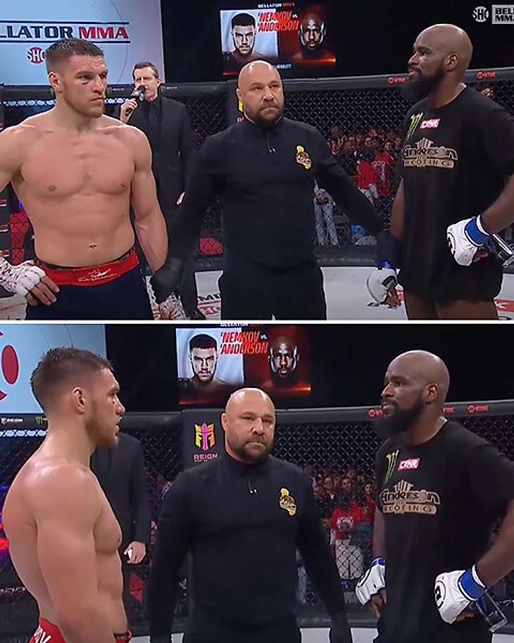 Титульный поединок прошел в ночь на 16 апреля на Bellator 277. Он начался конкурентно: бойцы поочередно занимали центр клетки, боролись за инициативу и пристреливались. Андерсон пытался перевести россиянина в партер, но Немков успешно защищался от тейкдаунов. А на выходе из клинча – хорошо попадал по претенденту. Как итог: все трое судей на карточках отдали раунд Немкову. Но дальше российскому чемпиону было сложнее.