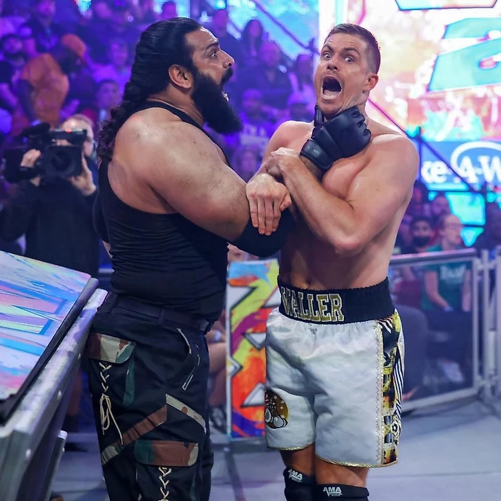2) Грейсон Уоллер победил Сангу после того, как толкнул того в рингпост, после чего добил фирменным станнером (3:28).