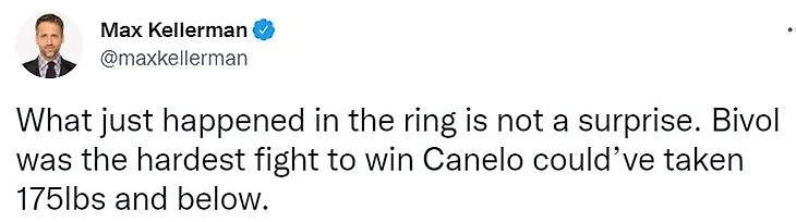 «Это было идеальное выступление. Для меня Бивол выиграл бой. Я думаю, что Канело выглядел немного вялым и усталым. Но я думаю, что это гениальность Дмитрия Бивола. Большой-большой шок, но сегодняшний вечер принадлежит Биволу», – заявил после боя промоутер боя Эдди Хирн.