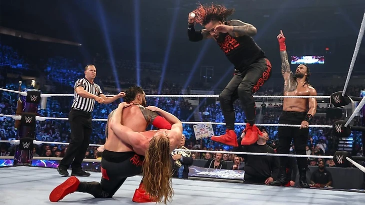 Джей в последний момент разбил удержание. МакИнтайр за это побил Джея в углу, провел ему суплекс, приготовился к Claymore, но Усо встретил его суперкиком. Двойной суперкик Дрю от командных чемпионов SmackDown, и Джей забрал право ведения боя у брата, пока Риддл сменился с Рэнди. Серния атак от командного чемпиона RAW, эксплоудер после колена Роману, попытавшемуся вмешаться. Колено Джимми, broton Джею, РК, фишермэн бастер. Floatin' Bro с третеьго каната, и Джей вырвался. RKO Джей перевел в сворачивание до 2, провел поп-ап некбрейкер, и Ортон разбил пинфолл. Джимми пришел на помощь напарнику, но Рэнди вытащил его за пределы ринга, где избил. Развернувшись, правда, он получил супермэн панч от Рейнса, которого в ступеньки напарвил МакИнтайр. А затем шотландец разобрал стол, решив провести чемпиону Вселенной бомбу на стол. Но Джимми отвлек МакИнтайра, получив хэдбатт, зато Роман пришел в себя, зарядив uranage на комментаторский стол. Риддл полетел дайвом через третий канат на самоанцев за пределами четырехугольника. А Джей полетел суисайд дайвом уже на Мэтта. Рестлеры вернулись в ринг, Усо провел энзигури, Риддл ответил коленом, за что получил суперкик. Восхождение для Uso Splash Мэтт прервал, проведя RKO с угла, но Роман в последний момент успел перехватить тэг у Усо, проведя Риддлу победный гарпун. Bloodline победили.