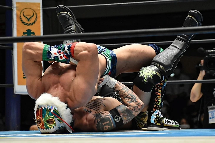 Как финалист прошлогоднего BoSJ ЙО до старта турнира выглядел одним из фаворитов, однако я бы не сказал, что его поединки so far выглядели как матчи одной из главных звезд турнира и потенциального победителя. Поединок с Эйсом продлился около 7 с половиной минут. Стартовый отрезок остался за Остином, который отметился коронным спотом с seated Fujiwara armbar, порезом пальца картой и Fosbury Flop за пределы ринга после пары коронных атак с апрона. По возвращении в четырехугольник ЙО сумел вернуться в бой, провел пару ударов, маневров и немецкий суплекс до 2. Однако довести матч до победы японцу не удалось, а Эйс улучил момент для House of Cards и The Fold принес ему еще 2 очка.