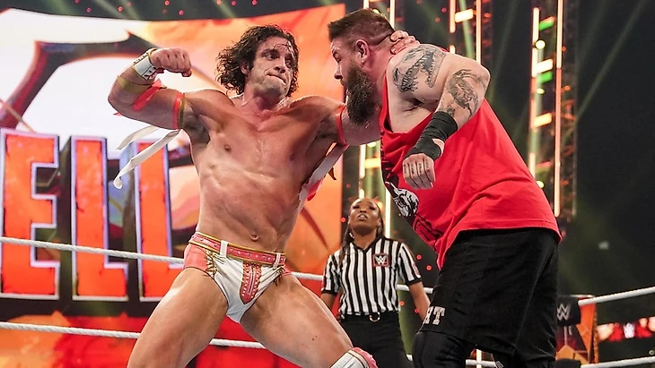 После стартового гонга Оуэнс напомнил противнику, что тот лжец… и получил жесткое колено в голову. Элбоу дроп от Зика до 2, и действие переместилось за пределы ринга, где рестлеры стали обмениваться ударами. Кевин был запущен в комментаторский стол, но ответил чопом и реверсировал запуск в стойку ринга, так что головой в рингпост влетел его соперник. Вернулся Иезекииль в ринг, чтобы получить DDT до 2, и стало видно, что у него разбита бровь. Мунсолт со второго каната от канадца последовал, но тоже только до 2. Еще немного доминирования от Оуэнса, и «брат Элайаса» перевел запуск в угол, так что Оуэнс жестко влетел в тернбакл. Обмен ударами, бэк элбоу от Иезекииля, и Кев встретил его бутом в углу, чтобы провести Tornado DDT до 2. Swanton Bomb Зик встретил коленями, провел серию страйков, настолько мощную, что Оуэнс уже признал в нем брата Элайаса, но Иезекииль на этом не остановился. Стингер сплэш, еще один, и от третьего Оуэнс ушел… влетев в спайнбастер до 2. Кев попытался «взорваться» станнером, но он был заблокирован… только для того, чтобы Оуэнс провел поп-ап пауэрбомбу до 2. Он снова стал кричать на визави, что тот на самом деле Элайас, получи пощечину, снова не смог провести станнер, попал в свораивание до 2, и Иезекииль зарядил очередное жесткое колено в голову. Восхождение на третий канат Кевин прервал, провел пару суперкиков, кэннонболл, и Оуэнс, прокричав ему в лицо «ELIAS!» провел победный станнер.