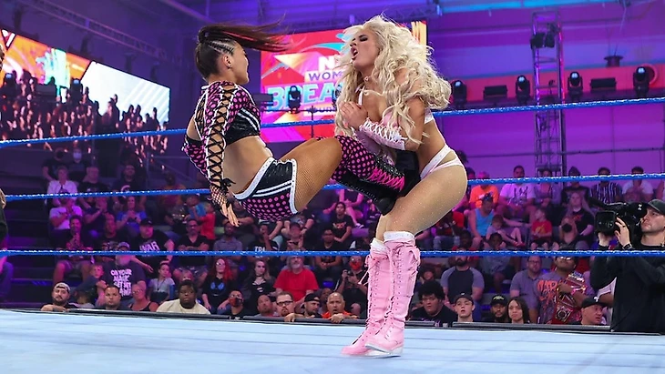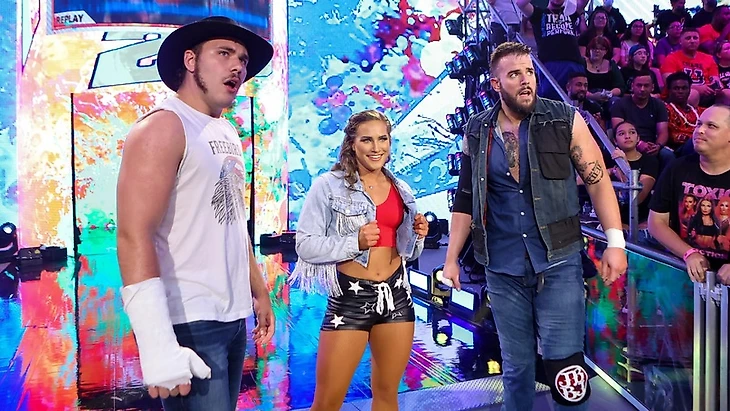 Тут же к рингу выходит Toxic Attraction. Знаете, тут вышел второй акт Darkest Dungeon 2, вот они в качестве Мобов бы туда подошли, даже название менять не надо было бы. Мэнди заявила, что Рокси может с тем же успехом пойти реализовывать контракт на RAW или «Смэк», а ещё лучше убрать его подальше в шкаф. Ведь это - лучший момент ее жалкой карьеры, дальше будет только хуже. Это может подтвердить ее подруга Картер, ведь она дважды проиграла. На ринг на помощь выбегает партнёрша Картер и начинается драка 3 на 3, фэйсы из неё выходят победителями.