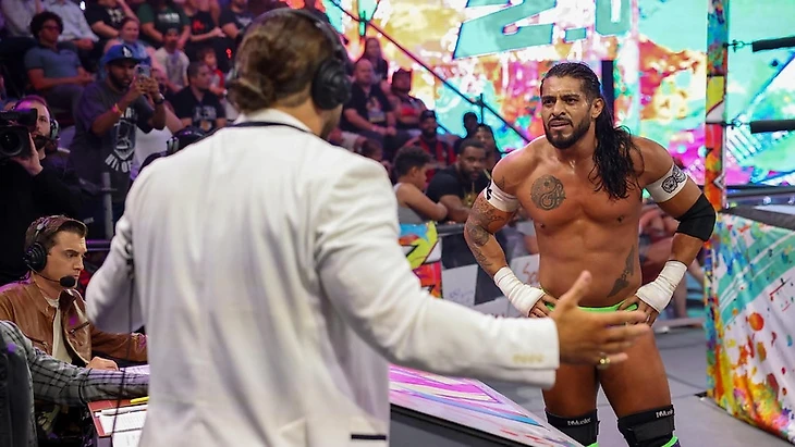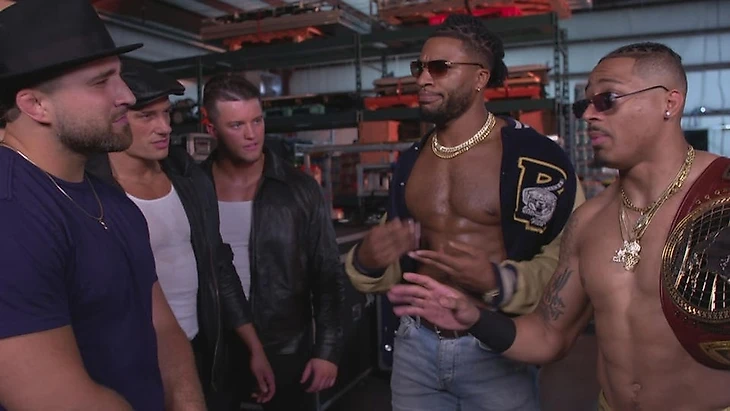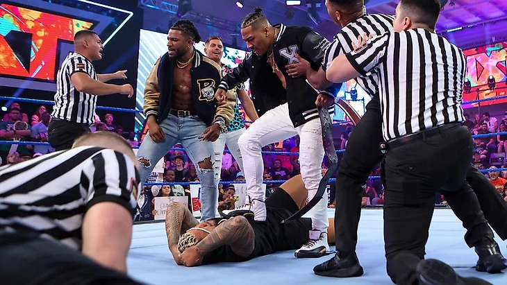 Промо прерывает Грейсон Уоллер. Он заявляет, что Соло следует успокоиться (Ус), и вообще, только потому, что он чей-то сын, племянник, что ему кто-то кузен или няня, он ничего получать не должен. Матч за титул ему не видать, и вообще, дело в друзьях, а не в страхе, у Сикоа их мало, ведь он Соло (руки чешутся вставить гачи шутку, так, надо успокоиться и писать обзор дальше). Соло отвечает, что понимает, что Грейсон хочет драки. Он не один, ведь с ним вселенная WWE. Соло бросается на чемпиона, однако драку один против троих не вывозит, а вселенная выбегать ему на помощь не спешит.