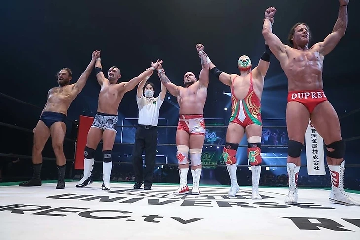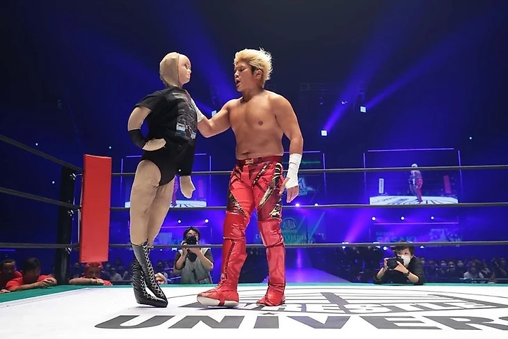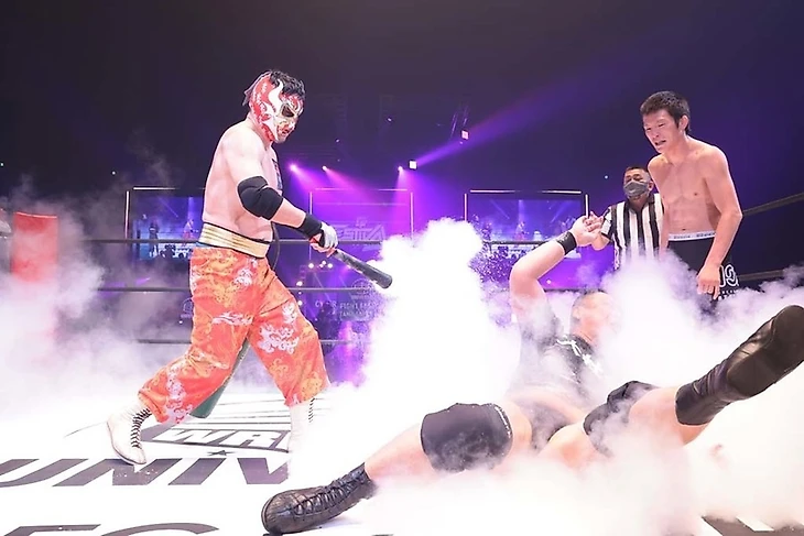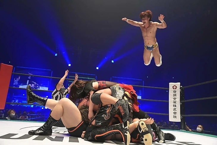 3) DDT: Pheromones (Даншоку Дино, Юки Ино, Юмехито Иманари и Акито Нишигаки) победили Санширо Такаги, Шинью Аоки, Кендо Кашина и Юмико Хотту. Как уже было сказано выше — несмотря на победу руководства над гламурной метросексуальной гей-бандой Даншоку Дино, Феромоны смогли взять последнее слово, сломив Акито и присвоив его к себе. А это вызвало внимание со стороны Санширо Такаги, к которому на помощь прибыл бывший полутяж NJPW и ныне тяжеловес NOAH Кендо Кашин. Сам матч — это просто трэш, содомия и какая-то неадекватная оргия, в которой господствовали Феромоны. Думается что создателями сериала «Пацаны» тут была предложена своеобразная концепция «Herorgasm», учитывая что Феромоны тут просто разрывали все немыслимые шаблоны самой гачи-победы из всех возможных в 2022 году. Отличились тут Юки Ино с его попытками совратить Кашина и Хотту, особенно последнюю (Ино однозначный милфхантер) и драма Такаги с Акито, для первого поведение Акито стало развывом всех адекватных шаблонов непредвзятого руководителя DDT. А сам Акито окончательно перешёл на ту самую «тёмную Dungeon-сторону» - он же помог Феромонам победить, оказав помощь Юки Ино в удержании Такаги через своё... невероятное достоинство сквозь штаны и трусишки (Личная оценка — 3,5);