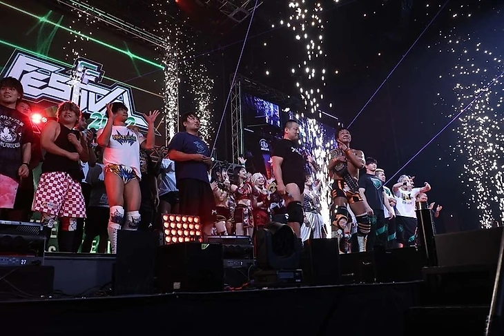 - Остаток пре-шоу комментаторы всех промоушенов обсудили между собой основные матчи PPV, особенно остановившись на мэйн-ивенте фестиваля между Го Шиозаки и Сатоши Коджимой. Основное шоу открыли анонсеры промоушенов и председатель медиа-компании CyberAgent, пожелав удачи рестлерам и зрителям. Не обошлось без небольшого танцевального номера в стилистике самураев, в котором засветился и Санширо Такаги. Напоследок прозвучал анонс всех матчей основного шоу.
