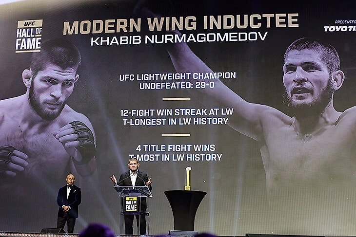 На International fight week в Лас-Вегасе прошла торжественная церемония включения бойцов в Зал славы UFC. В 2022-м список легенд пополнили Даниэль Кормье и Хабиб Нурмагомедов. Экс-чемпион промоушена в легком весе стал первым бойцом из России, который попал в Зал, а на сцене Хабиб выдал 25-минутную речь, в которой вспомнил все: и начало пути, и отца, и спарринг-партнеров, и нахлынувшую популярность.