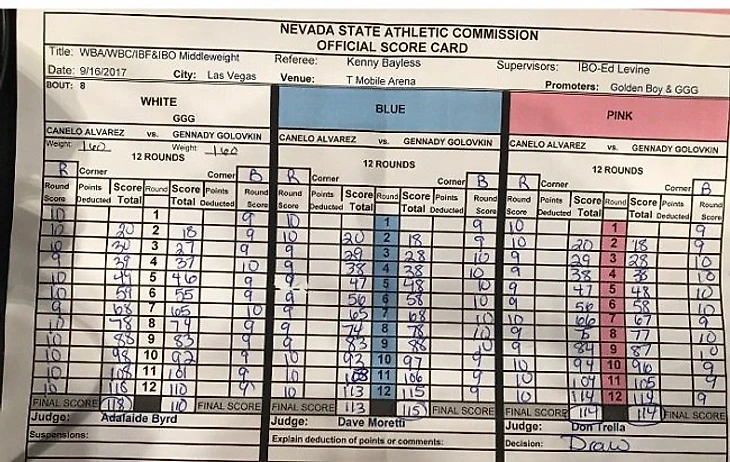 И все решил последний 12 раунд. Я думаю многие слышали такую фразу: "Надо забрать концовку". Почему? Это психология человека и это даже не связано с спортом - люди запоминают только начало и конец, весь проделанный путь никому не интересен и не будет запоминаться, если только в этом пути что-то невероятное не произойдет. Так и с боксом, ты начинаешь хорошо с хороших панчей, весь раунд ты можешь просто стоять или бегать, берешь конец раунда - последние 10-15 секунд. И все, тем самым за тобой будет первое впечатление, ведь ты начал раунд активно и закончил его активно, показав, что не устал и оставил последнее впечатление о себе. И именно так и произошло в фатальном 12 раунде: Альварес забирает концовки и двое судей дали 115:113 в пользу Сауля и третий судья посчитал ничью 114:114.