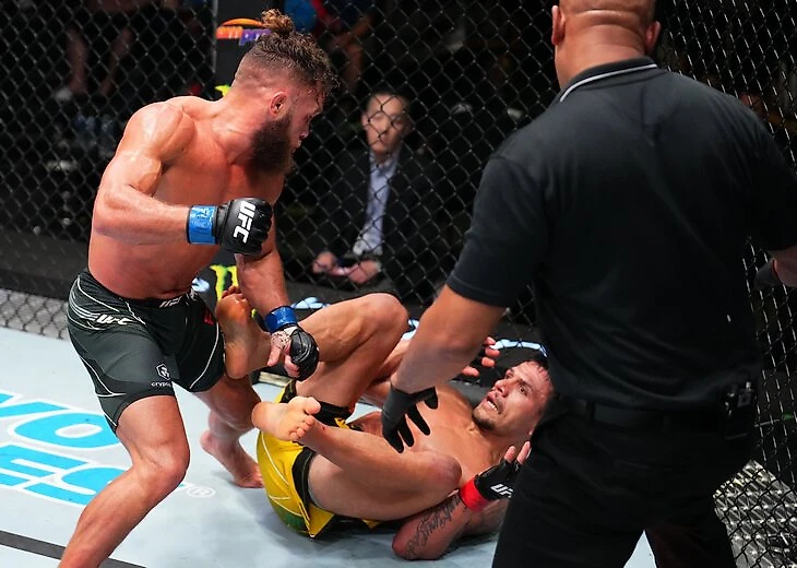 Эту комбинацию Физиев пробовал на протяжении всего боя: он делал обманный удар коленом, чтобы выйти на ближнюю дистанцию и раскрыть соперника, который пытается блокировать панч в корпус. После чего выбросить две бомбы прямо в раскрывшуюся челюсть. До пятого раунда эта комбинация проходила, но нокаутировать Дос Аньоса не удавалось. А вот в последнем раунде ветеран рухнул – и Физиев забрал в коллекцию новый зрелищный финиш и бонус за лучшее выступление вечера.