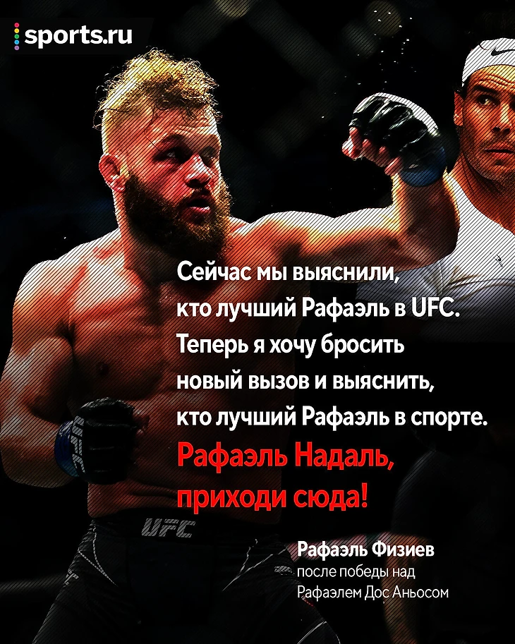 После победы Физиев снова дал яркое интервью и вызвал на бой теннисиста Рафаэля Надаля. Логика проста: Физиев выявил сильнейшего Рафаэля в UFC, а теперь хочет узнать лучшего в спорте. Конечно, это шутка, ведь до этого Физиев уже вызывал на бой Хасбика. Поэтому Рафаэль уточнил, что следующим в UFC хочет соперника из топ-5.