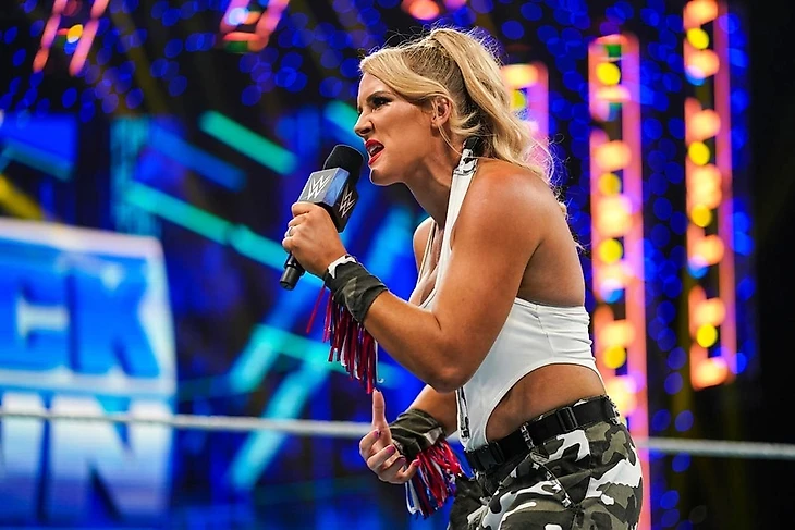 – На ринг вышли Алия и Лэйси Эванс для матча против Шейны Бэйзлер и Шотци Блэкхарт. Правда Лэйси перед своим выходом дважды показывала, что не готова к этому, пока не получит должной реакции на себя, чем вызвала недоумение Алии. Да и зрителям такое не понравилось со стороны Эванс. С третьей попытки Лэйси всё-таки вышла к рингу, но сразу же схватилась за микрофон из зоны таймкипера, правда зрители не прекратили негативить в сторону Эванс. Лэйси принялась в ответ выражать недовольство по поводу того, что она не понимает — почему они так настроены против неё, ведь она рассказывала о себе. Но выходит что никому это оказалось не нужно? Разве этой реакции она достойна? Но если уж на то пошло, то Лэйси будет вести себя также в ответ, несмотря на то, что она признанный герой США. Если они так поступают с ней, то они могут все идти к чёрту. Эванс была готова покинуть ринг, но Алия призвала её не уходить из-за назначенного матча. Лэйси ничего не ответила, а вырубила Алию своим Woman's Right (Не думаю что это прям гениальный ход вот так с ходу дать хилтёрн Лэйси, тем более после нескольких месяцев промоутирования её как фейса и американского патриота, героя и т. д. Я понимаю что в истории WWE бывали такие моменты, тот же Сержант Слоутер самый яркий пример. Но тот был годами в роли патриота своей страны, а потом уже его хилтёрн стал одним из самых легендарных и даже эффектных. А тут что? Провал Лэйси? Сомнительно. Ведь она только-только стартовала со своим забегом и толком не провела ни одного полноценного сторилайна в роли фейса-патриота. А сейчас что? Я лично сбит с толку, да и мотивация какая-то неубедительная. Ладно бы она как-то расставила акцент своего поражения на MITB, а так она же сама вышла на ринг с третьего раза, проверяя реакцию местной публики и по сути этим их разозлила, так как заставила их ждать своего выхода. Так что не знаю как остальным, но я такого тёрна от WWE не оценил по достоинству — мало того что слишком рано провели этот хилтёрн, так и по какой-то надуманной причине, показав Эванс провокатором. А как хила Лэйси многие уже видели, WWE по сути сами спустили в унитаз перспективы развивать тему биографии Эванс с позитивной стороны, показав бывших военных как нытиков);