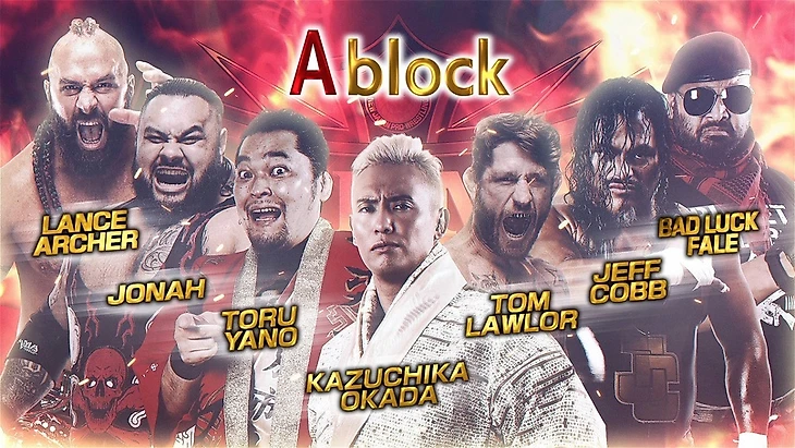 Блок А. Эту группу можно назвать «блоком монстров», ибо тут мы видим и Кобба, и Арчера, и ДЖОНУ, и Бэд Лака Фале, и Тома Лоулора, который пусть и не здоровяк, но вполне монструозно выглядит. Тем не менее, если попытаться выявить явных фаворитов, то, имхо, их тут двое: Казучика Окада и Джефф Кобб. Я надеюсь, понятно почему. Друг с другом они встречаются, как мы уже видели, на первом турнирном дне, а последние их поединки пройдут против Лэнса Арчера (у Окады) и Тома Лоулора (у Кобба). В общем, при всем при том, я бы сделал ставку на то, что выйдет в полуфинал именно Окада (хотя бы потому что я не представляю, чтобы «Рэйнмэйкер» не вышел в полуфинал такого турнира, учитывая его букинг).