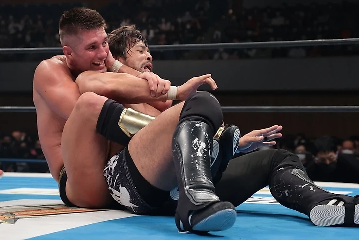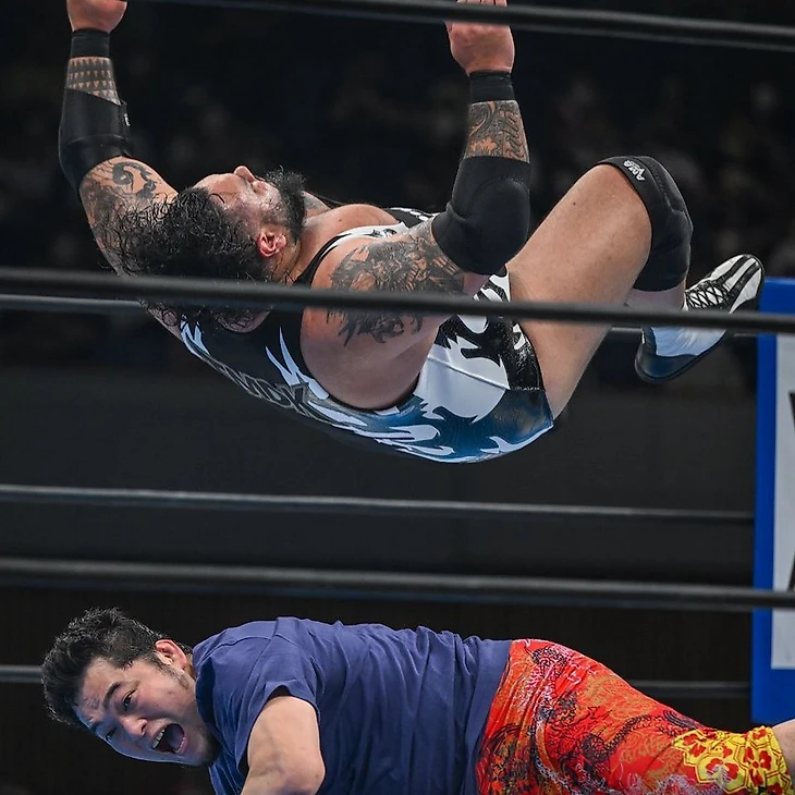 Матч стартовал между Финли и Лоулором, но Том начинать отказался и передал тэг Айзексу. Ройс почти забрал себе старт за счёт силы, но дропкик от Финли позволил фэйсам забрать инициативу. И да, Финли все ещё в числе фэйсов НовоЯпонии, а не в Хаосе. Однако Дэвид выходит на апрон, где его ловит Том в вариацию захвата лодыжки, после чего Ройс сбивает Финли в баррикады. Действие возвращается в ринг, тэг Тому, сбивают ЙОШИ-ХАШИ с апрона. Начинают позировать гости со STRONG, но тут вмешивается ЙОШИ, ему удаётся вывести с ринга Ройса, однако Лоулор ловит соперника в октопус холд и отправляет представителя CHAOS за ринг. Техническая борьба с Дэвидом кончается запуском в угол, где неожиданно его встречает удар Ройса. Целый ряд грязных удушений об канаты, гильотина от Тома Лоулора, которую Дэвид реверсирует в Irish curse backbreaker. Смена партнеров, размен между Ройсом и ХАШИ уходит полностью в пользу последнего, смена на Дэвида Финли, но Том Лоулор ловит его в гильотину с апрона, пока Айзекс отвлекал судью. Немецкий суплекс из мёртвой тяги, спасает партнера ЙОШИ-ХАШИ, Том Лоулор забирает его на себя за рингом, но отбивается от суплекса из мертвой тяги Дэвид, Прима Нокта, Трэш Панда, до трёх.