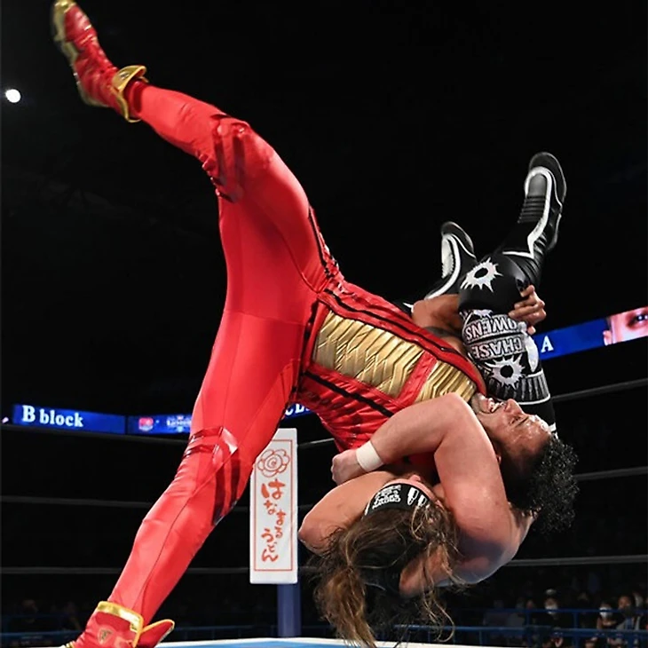 Казучика и Тору совсем скоро встретятся в матче Блока А, поэтому, несмотря на то, что они являются членами одной группировки, здесь Окада и Яно выступали в противоположных командах. Одним из самых ярких моментов поединка стало то, что Яно был настроен крайне серьезно, и они даже поработали друг с другом за пределами четырехугольника, и Тору жестко запустил «Рэйнмэйкера» в баррикады. В ринге же мы наблюдали за плюс-минус классическим действом с обеих сторон: Казучика отметился парой коронных атак, ХАШИ раздавал Ойве чопы, да и Яно показал пару своих маневров обоим визави. В концовке Рехей ушел от командной работы, так что Окада получил чоп от ЙОШИ. Молодой Лев пару раз свернул ЙОШИ-ХАШИ до 2, попав в конечном счете в Butterfly Lock, от которого Ойва сдался спустя чуть меньше, чем 7 с половиной минут после стартового гонга. Тору же атаковал Казучика после гонга за пределами ринга, но теперь уже Яно был запущен в ограждение, после чего ретировался, пока Окада совсем не разозлился.