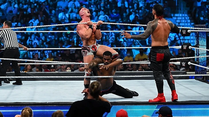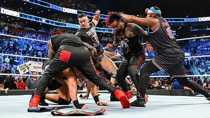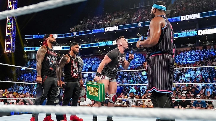 Тиори, чтобы создать дистанцию между собой и Bloodline, даже поднялся на ринг. Джей отметил, что никто не знает, как жить, не упоминая имя Вождя Племени. И если Тиори еще раз упомянет имя Романа, то Усо обещают ему, что Остин не доживет до SummerSlam. Монтез и Анджело посмеялись над Тиори. Обладатель кейса юмора не понял, единственное, что ему кажется смешным, это то, что Форд и его жена вместе уйдут с главного шоу сезона без титулов. Тез же сказал Усо, что те не покинут Бостон, не получив по морде, после чего претенденты на командные титулы напали на чемпионов. Тиори, посмотрев на все на это, решил принять участие в драке на стороне Bloodline, но на помощь «Профитам» прибежал Мэдкэп Мосс, который получил чемоданом от Тиори на прошлом SmackDown и явно не забыл об этом. Он провел тэкл Тиори, но Джимми и Джей стали забивать его вдвоем. На помощь Моссу пришли Street Profits, и в итоге «хорошие» парни побили плохих, отправили Усо за пределы ринга… а потом и Тиори туда же отправили двойным суперкиком от SP. Дайв от Доукинса на всех троих за пределами ринга завершил этот сегмент.