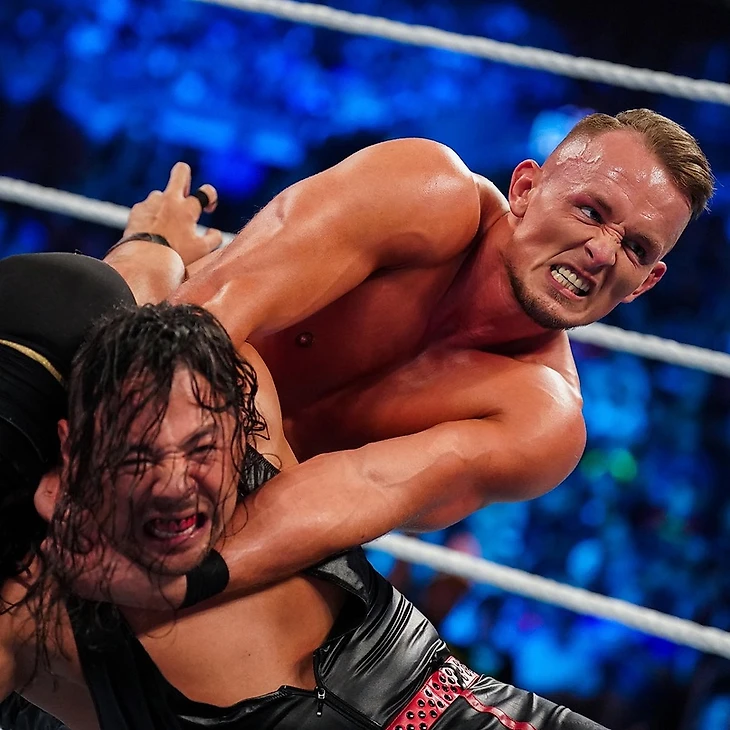 Гюнтер присутствовал в углу Кайзера. Гонг прозвенел, и Людвиг принялся забивать визави в углу, не гнушаясь грязи. В общем, стартовый отрезок остался полностью за европейцем, пока Шинске не поймал его киком в корпус, добавив еще несколько киков в углу и knee drop. Удержание до 2, еще пара атак в углу, одну из которых Кайзер реверсировал, проведя butterfly suplex и жесткий РК до 2. После снэп суплекса Накамура снова вырвался, а редкие фанаты в зале стали подбадривать японца. Это сработало, он поймал момент для кика в затылок, проведя коронное колено оппоненту, лежащему на верхнем тернбакле. Откатившись на апрон, Людвиг заблокировал РК с апрона, обрушив оппонента лицом на этот самый апрон, а затем впечатав в ступеньки. Вернувшись с рекламы, мы увидели, что Кайзер все еще доминирует, однако Шин ушел от суплекса, провел коронный степ-ап кик в голову. Серия страйков от Накамуры и sliding knee последовали, а затем Шинске вышел еще и на коронный sliding German до 2. Отбившись от второго немецкого суплекса, Кайзер вбежал в биг бут и получил колено с канатов, вновь укатившись за пределы ринга. Король вернул визави обратно, но на пути Шинске в четырехугольник встал Гюнтер. «Come On!!!!» — прокричал ему Накамура в своем уникальном стиле, но Интерконтинентальный чемпион даже не намеревался его трогать. Шинске вернулся в ринг, попал в сворачивание до 2 и зарядил еще один кик. Подготовку к Киншасе сорвал Гюнтер, поднявшийся по ступенькам. Накамура отвлекся, Людвиг хотел воспользоваться этим, но сам попал в сворачивание до 2. Вырываясь, Кайзер направил соперника к канатам, где его атаковал Гюнтер. Коронный DDT, и Кайзер победил. Дойдя до стэйджа, Людвиг праздновал победу, но ВАЛЬТЕР прервал это торжество. Он потребовал, чтобы подопечный подготовился принять еще один чоп. Кайзер смиренно повиновался… но Гюнтер похлопал его по плечу, чтобы зарядить-таки чоп, когда Людвиг расслабился.