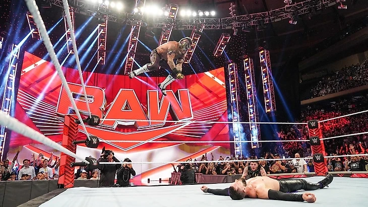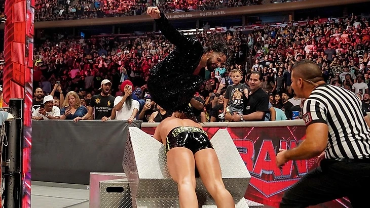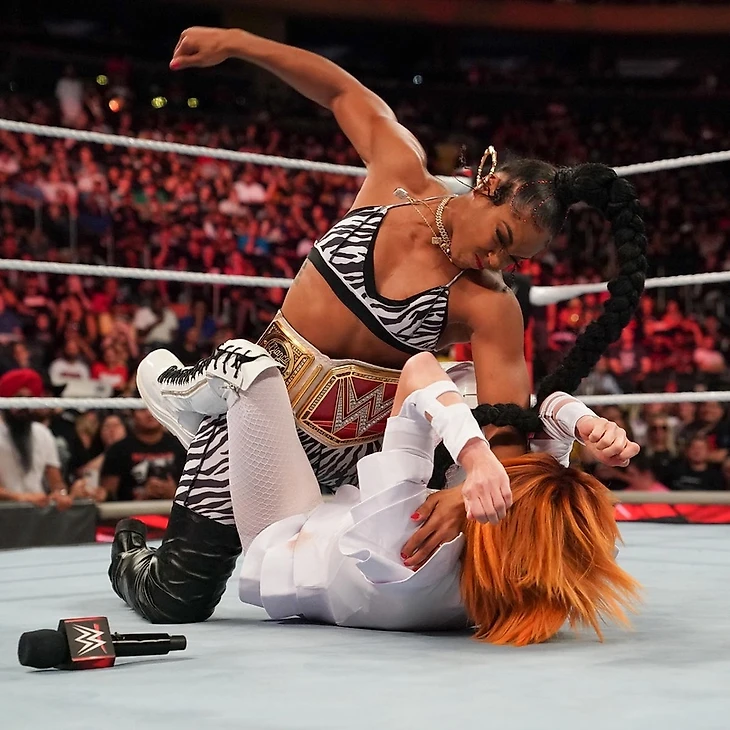 – На ринг вышла женская чемпионка RAW WWE Бьянка Белэйр, видимо готовясь к финальному слову и даже встрече с Бекки Линч лицом к лицу. Также был повтор событий с прошлой недели вокруг этого противостояния, не забыв упомянув кратко о втором реванше с Кармеллой. Бьянка не успела сказать даже словечка, как на ринг вышла Бекки с микрофоном в руках. Линч пыталась начать вне очереди, а Белэйр перебила ирландку. По сути у них даже перепалки не сложилось, ибо Белэйр своей старой-доброй фишкой о самой себе с окончанией -EST взбесила Бекки и та устроила драку с чемпионкой. Драка проходила с переменным успехом, дамы едва не разнесли рингсайд в зоне стола комментаторов и таймкипера. Обеих с трудом разняли Адам Пирс с продюсерами и группа рефери (Нууууууууууууу.... это было быстро и куда результативнее очередного их диалога между ними. Что удивительно кстати);