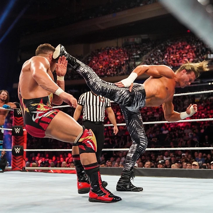 5) Дольф Зигглер и ЭйДжей Стайлз победили Alpha Academy. Перед матчем состоялось краткое интервью по поводу того, что случилось в командном матче при участии Тиори. Дольф объяснил Кевину Патрику свои действия возможностью преподать Тиори урок уважения, учитывая все его выкрутасы о том какой он симпатичный, защищённый и неприкасаемый. Тиори вкусил слишком много славы и не способен осмысленно понять что это такое. Тут объявился Стайлз и приготовился критиковать Дольфа за его прошлые аналогичные огрехи после первых больших успехов. Но самого Стайлза тут же перебил Чад Гейбл с Отисом под руку. Гейбл просто выразил мнение, что ЭйДжей и Дольф просто завидуют успехам Тиори в его возрасте, ибо сами не добились аналогичного в его возрасте (тут бы я хотел поспорить, вспоминая титулы Стайлза в NWA до основания TNA, но это было бы всё равно так себе сравнение). Чад заявил, что готов с Отисом выбить всю зависть из них обоих. Зигглер и Стайлз приняли вызов, забыв о своих потенциальных разногласиях. Прямо перед боем Гейбл устроил зрителям MSG и Нью-Йорка в целом прожарку, обвиняя их в отсутствии уважения к достижениям Чада как одного из самых умных людей со званием магистра наук. Хотя он и не ожидал другого от людей, живущих на острове, который скоро исчезнет с карты мира из-за того количества мусора, который эти люди тут и создают. А Стайлз и Зигглер у Чада вызывают ассоциации с местной баскетбольной командой, которая также выступала периодически по воле случая, а не с общей целью и мотивацией. Бой хоть и был коротким, но максимально активным и без провисаний, причём у Стайлза и Зигглера выявились зачатки командной химии, а Гейбл показал свой борцовский гений (Личная оценка — 3);