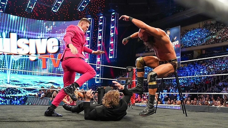 – На ринге состоялось первое ток-шоу от Логана Пола «ImPAULsive», по такому случаю Логан принарядился в классический костюм. Также перед выходом с Полом говорил ЭйДжей Стайлз, который дал ему парочку советов и пожелал Логану удачи, чтоб заткнуть Миза окончательно (занятно что Стайлз успел указать, что ему сам Логан также не по душе, но Миз куда больший мудак в данной расстановке). Логан начал с приветствия жителей Нью-Йорка на его первом выпуске ЕГО же шоу, которое должно переплюнуть то самое Miz TV. Попутно Логан отрекламировал один из предстоящих матчейпо боксу своего брата Джейка, который и состоится скоро в MSG. Но в целом Пол не стал тянуть и решил вызвать на ринг Миза для финального Face-to-Face. Логан звал Майка как минимум 3 раза, но на каждое молчание добавлял искру неуважительного отношения к Мизу, намекая на его трусливость и... Здесь вместо Миза вышла Марис, по пути критикуя Логан за его ненависть к успеху их с Мизом ТВ-шоу (Miz and Mrs) и держа в руках два больших шарика, которые только и годятся как украшения для новогодней ёлки. Далее Марис от нервов путалась в словах, когда пыталась обвинить Логана в постоянной внеэфирной дискредитации Миза. А как только она упомянула о гениталиях своего мужа, фанаты принялись чантить «крошечные яйца», хотя Марис добавила, что согласно научным исследованиям.. средний в своей норме размер мужских яиц до 2 дюймов, а у её мужа и вовсе куда больше. Логан (как и я во время этого действия) полностью невтуплял о чём так Марис яро пыталась говорить в защиту мужа, но это прекратилось с выходом Миза. Майк сразу же начал рассуждать о том, что Логан сейчас тут только благодаря Мизу, что именно Миз его научил многим тонкостям работы в WWE. Но если Логан не готов показывать свою благодарность Мизу, то последний покажет Полу кто такой Миз на самом деле, именно того самого, кто заработал звание 2-кратного чемпиона Большого Шлема WWE и победил Джона Сину в мэйн-ивенте WrestleMania 27. Логан на фирменном от Майка «AWEEEEEEEEEESOME» крикнул ему заткнуться и перестать постоянно болтать-болтать-болтать. Логан снова указал, что у Миза от этого яйца не станут больше и отхватил пощёчину от Марис, за что Логан похвалил её... сказав что у неё куда больше яйца чем у её мужа. Миз был готов устроить драку, несмотря на запереживавшую Марис, однако тут вмешался Чиампа и уже вместе с Мизом оба с концами добили Пола. Что любопытно, но закономерно — зрители зачантили «One More Time» после финишера от Миза. Это уже сказало абсолютно всё (А мне тут добавить нечего, потому что анализировать всё это, то что осталось от Винса... простите, но это выше моих сил, если суть этого фьюда в разговорах о чужих яйцах);